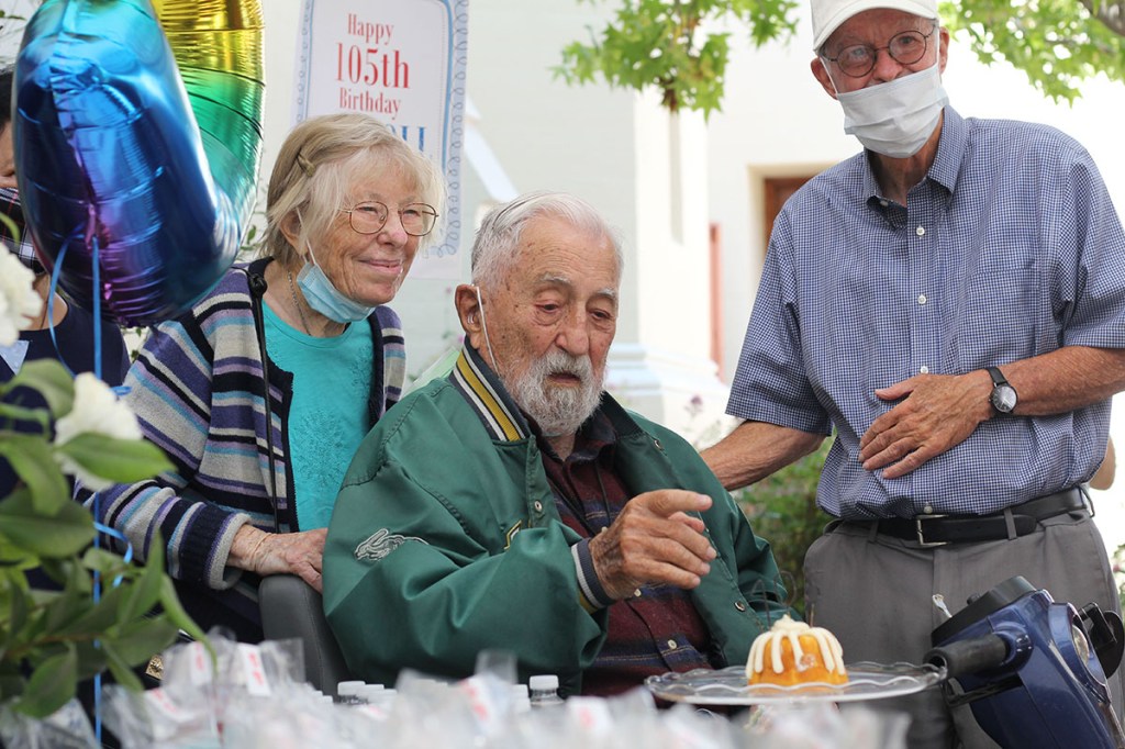 After the midday Mass, Father John Ryan and the church hosted a COVID-safe birthday party for Schmitz in the church’s flower garden. Many people walked up to Schmitz, greeted him with praise and gifts as he sat on his electric scooter in front of mylar balloons and a personal cake, lit with sparkling candles.