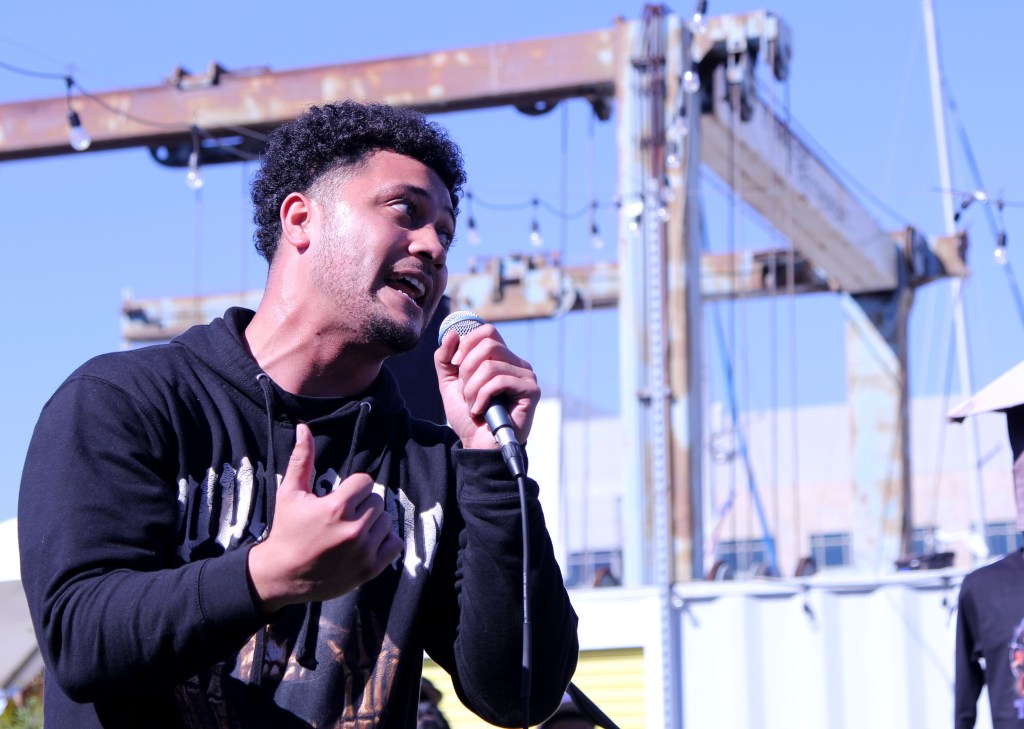 Kava Cassidy, stage name CameupKav, raps for the crowd at the Ramp Restaurant, Bar and Music Venue on Oct. 17 2021. Cassidy was the opening performer for the Love My Life Tour, a group of independent Polynesian artists from the Bay Area. Photo by Nick Mazzoni